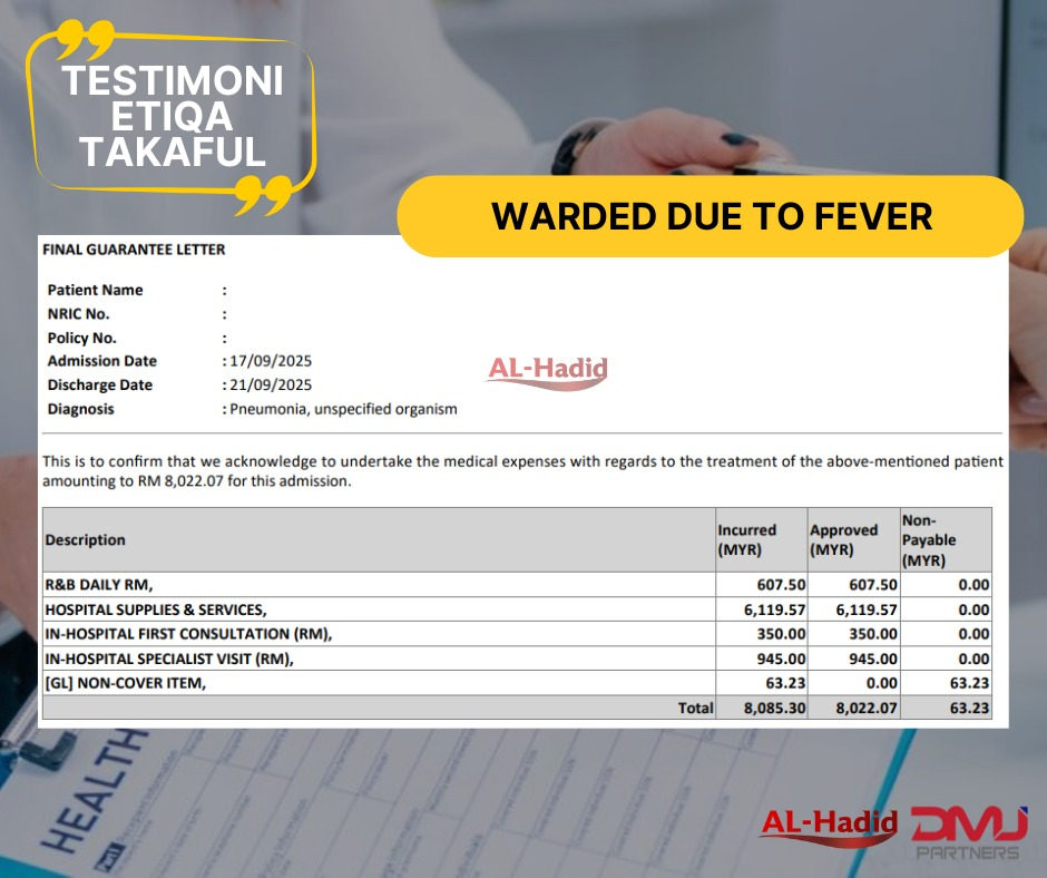 “Demam berpanjangan sampai warded, alhamdulillah bil hospital settle oleh takaful.”